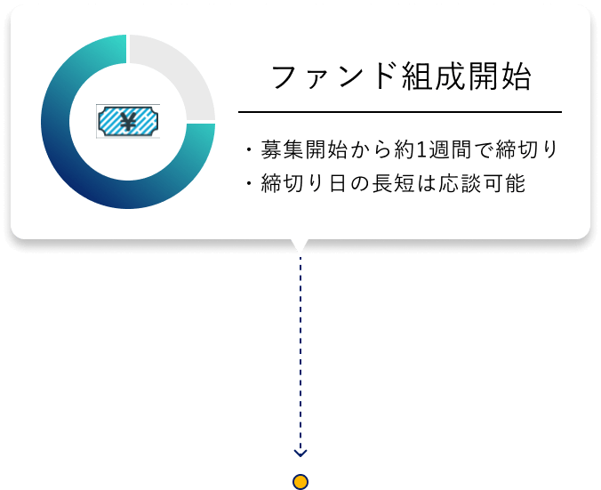 ファンドの成立については確約できません。ファンドの募集前にSNSによる事前告知や投資家全員に対しメルマガ等で告知を行う等、最善を尽くしますが成立に至らない可能性は御座います。